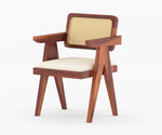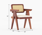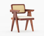 The matching chairs are designed with distinctive angular legs and comfortable armrests, while the woven cane backrests add a perfect blend of vintage elegance and modern appeal. Soft, light-colored cushioned seats provide superior comfort and a refined contrast to the rich wooden tones.
