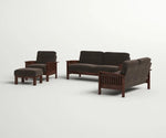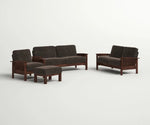 This wooden sofa set features a strong and elegant solid wood frame with beautifully crafted armrests designed in a vertical slat pattern. The set includes a three-seater sofa, a two-seater sofa, a single chair, and an ottoman, offering complete comfort for the living room. Each piece is upholstered with plush dark brown cushions, providing both style and relaxation. The rich wooden finish enhances the natural grain of the wood, giving the set a timeless and durable appeal. Perfect for modern and traditional interiors alike, this sofa set combines comfort with classic wooden craftsmanship.